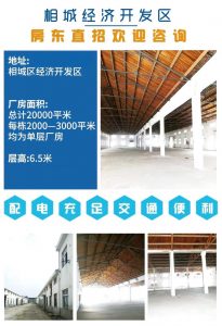 厂房总面积20000方,多栋2000-3000方单层厂房,层高6.5米,交通便利,配电充足